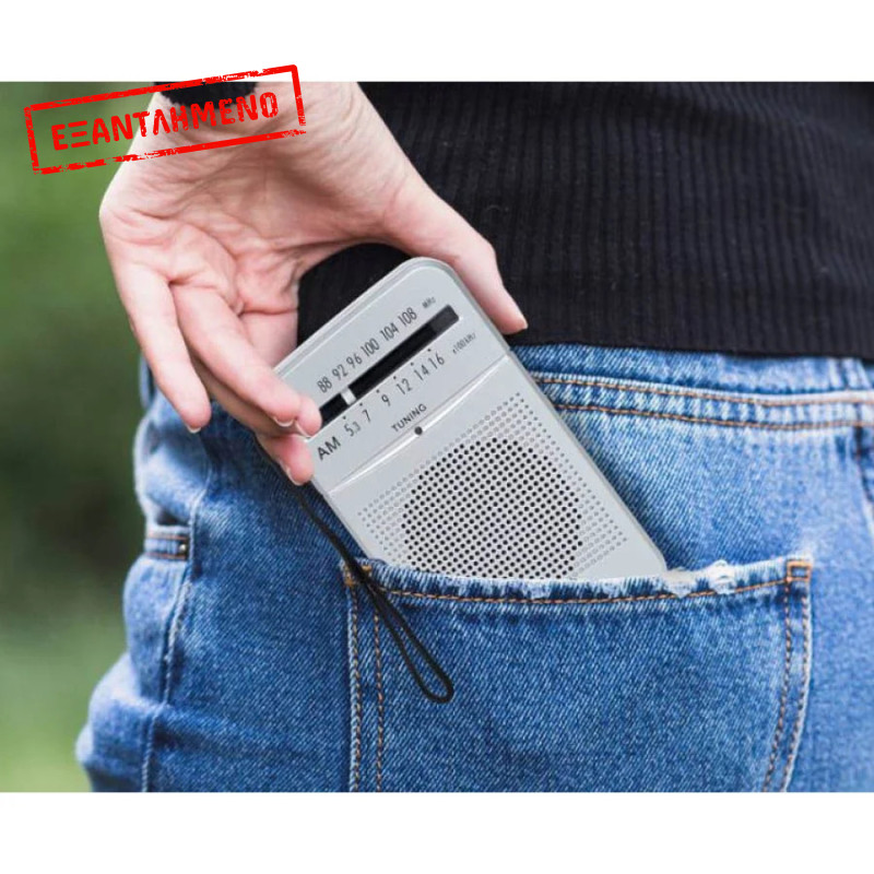 Ραδιόφωνο τσέπης με τηλεσκοπική κεραία και τροφοδοτικό μπαταρίας, σε μαύρο χρώμα.