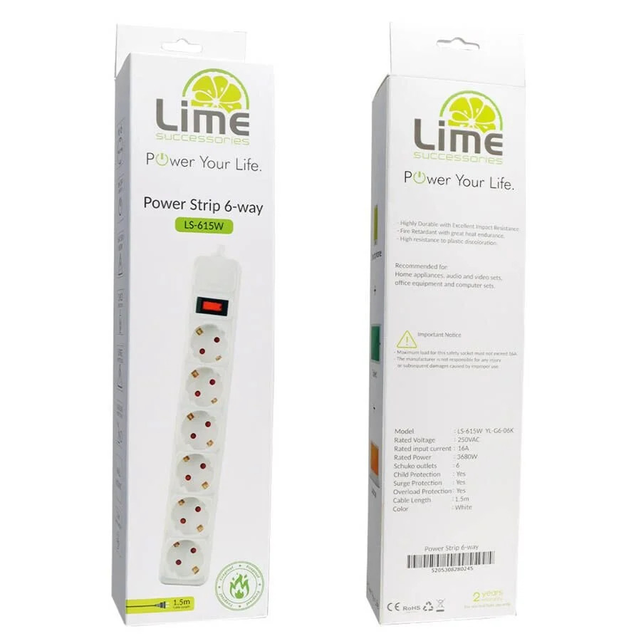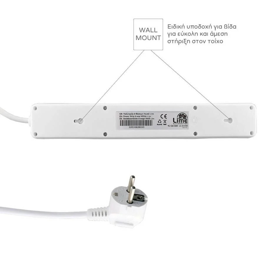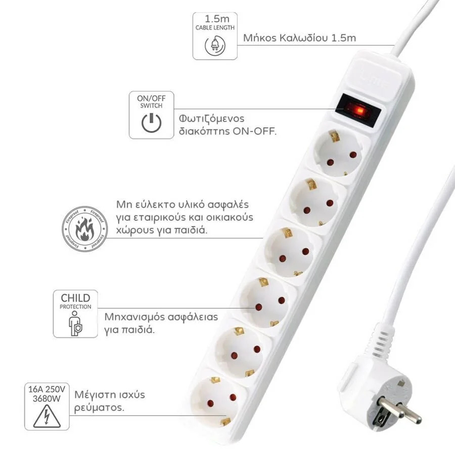 Πολύπριζα 6θ Με Διακόπτη 1,5M,3g1,5 με προστασία λευκό LS-615W LIME