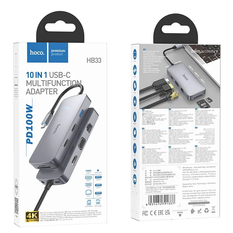Hub USB-C Hoco HB33 Easy 10-in-1 με HDMI 4K USB-C PD100W USB3.0 2xUSB SD Micro-SD RJ45 VGA and 3.5mm Γκρι 18cm