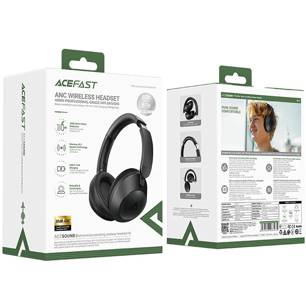 Wireless Ακουστικά Hi-Fi Stereo Acefast H3 500mAh v5.3 30db ANC AUX USB-C Fast Charge IPX4 Μαύρα με Memory Foam Μαξιλαράκια και Θήκη
