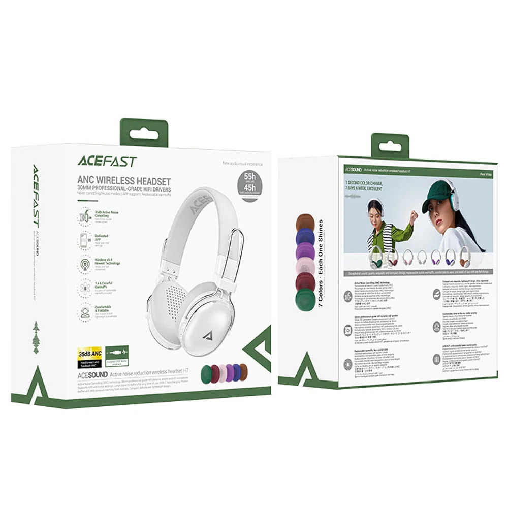 Wireless Ακουστικά Hi-Fi Stereo Acefast H7 500mAh v5.4 35db ANC IP54 Fast Charge Λευκά με Memory Foam 7 Διαφορετικών Χρωμάτων Μαξιλαράκια και Θήκη