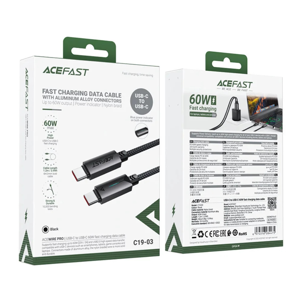 Καλώδιο Acefast C19-03 Μεταλλικό USB-C σε USB-C 60W 3.0A Γρήγορη Φόρτιση USB2.0 με Ένδειξη Φόρτισης Braided Μαύρο 1.2m