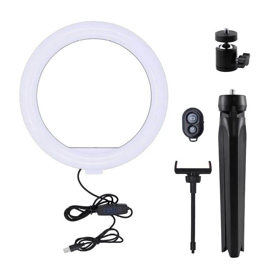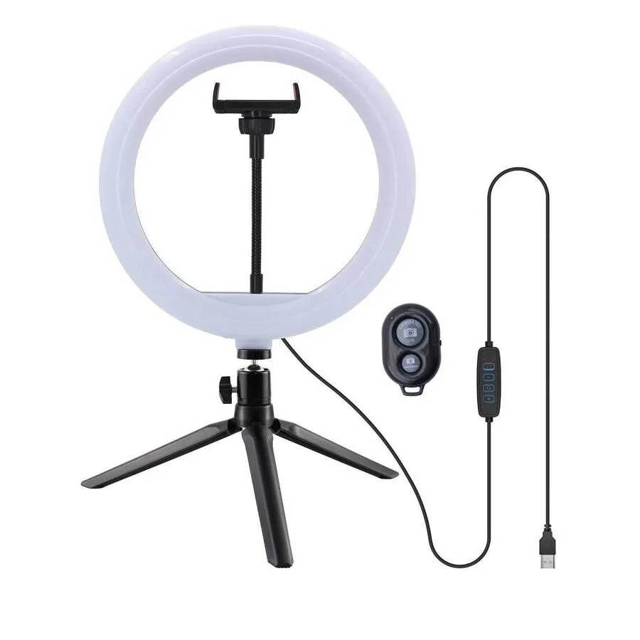 Το σετ περιλαμβάνει: κυκλική λάμπα LED, βραχίονα με σφιγκτήρα για το τηλέφωνο, τρίποδο, περιστρεφόμενη κεφαλή, τηλεχειριστήριο bluetooth για ενεργοποίηση.